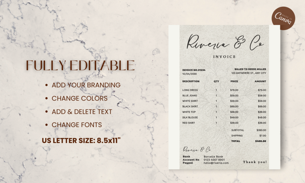 - Customize with your business logo, invoice specifics, and payment terms effortlessly.